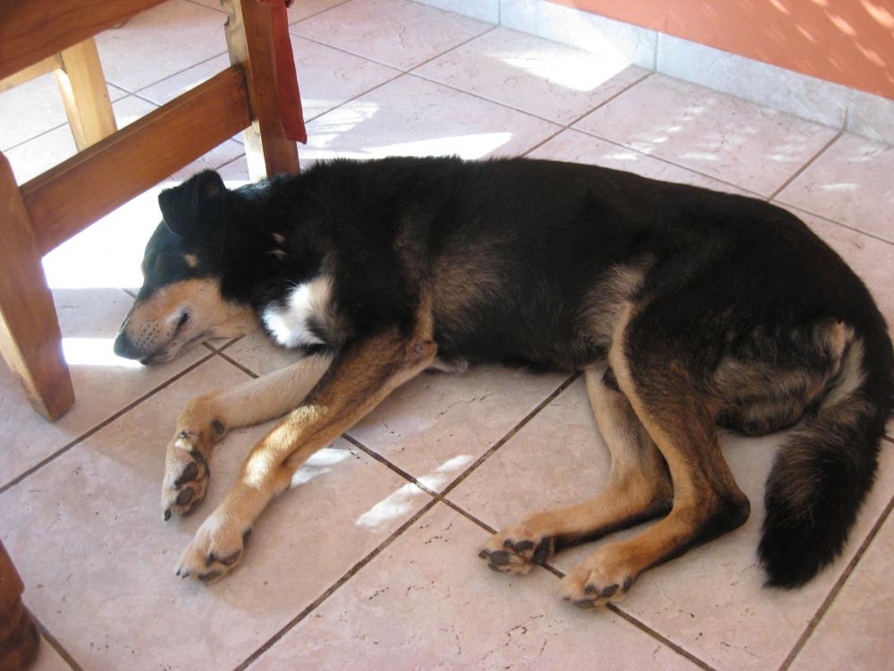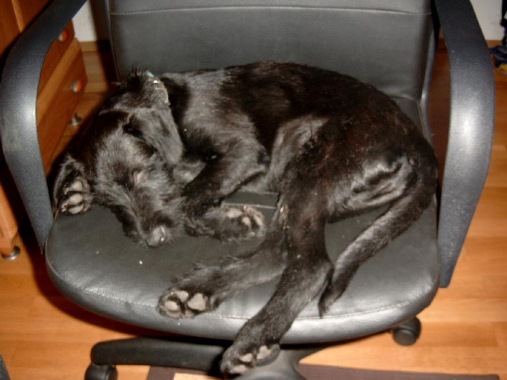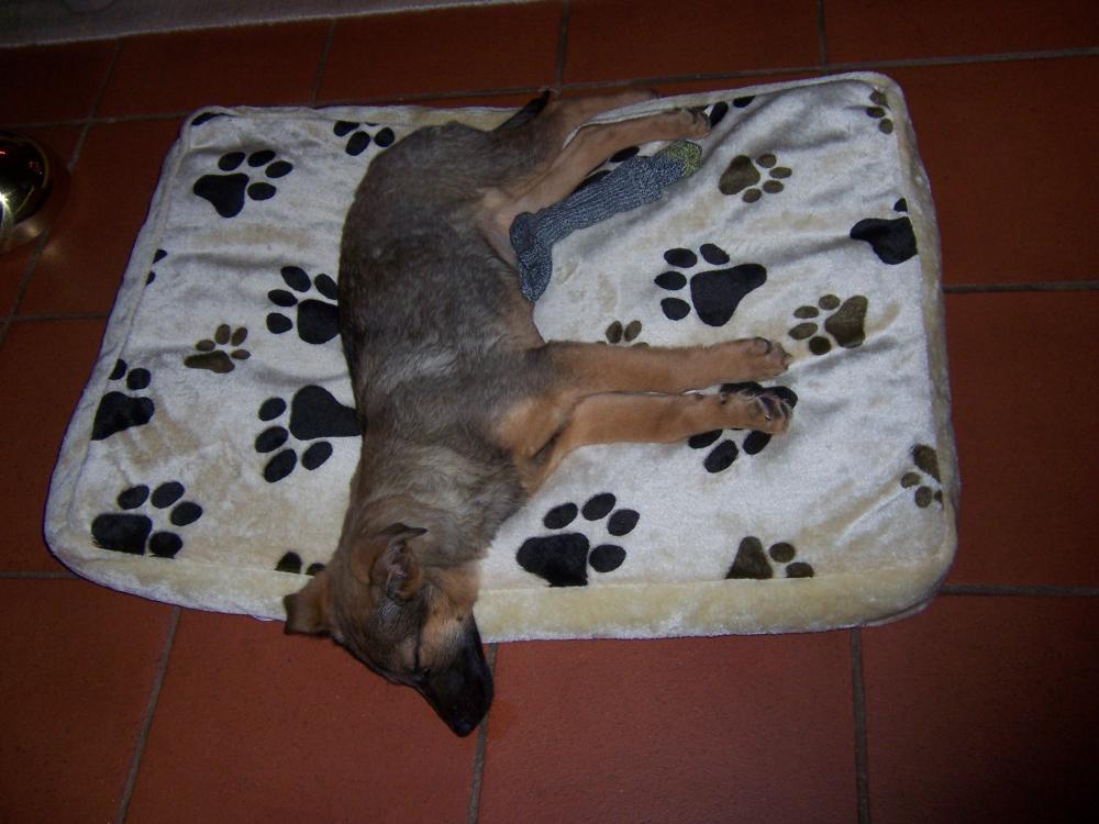 Nach anfänglichen Dauerläufen fand er nun die ersehnte Ruhe und beschäftigt sich lieber mit seinem Lieblings-Kauknochen!