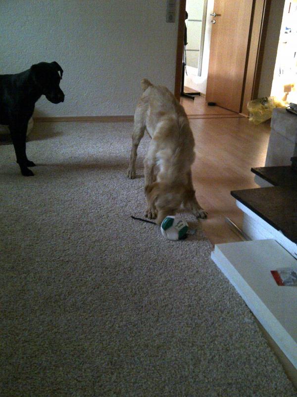 Anton, der hübsche Retriever-Mix, lässt sich von seiner tollen Familie in Wuppertal bespielen. Hier hat er jede Menge Abwechslung.