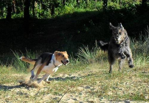 Auf der Hundewiese tobt Marlon mit der Lena auch schon ohne Leine rum. Da geht der kleine richtig ab.